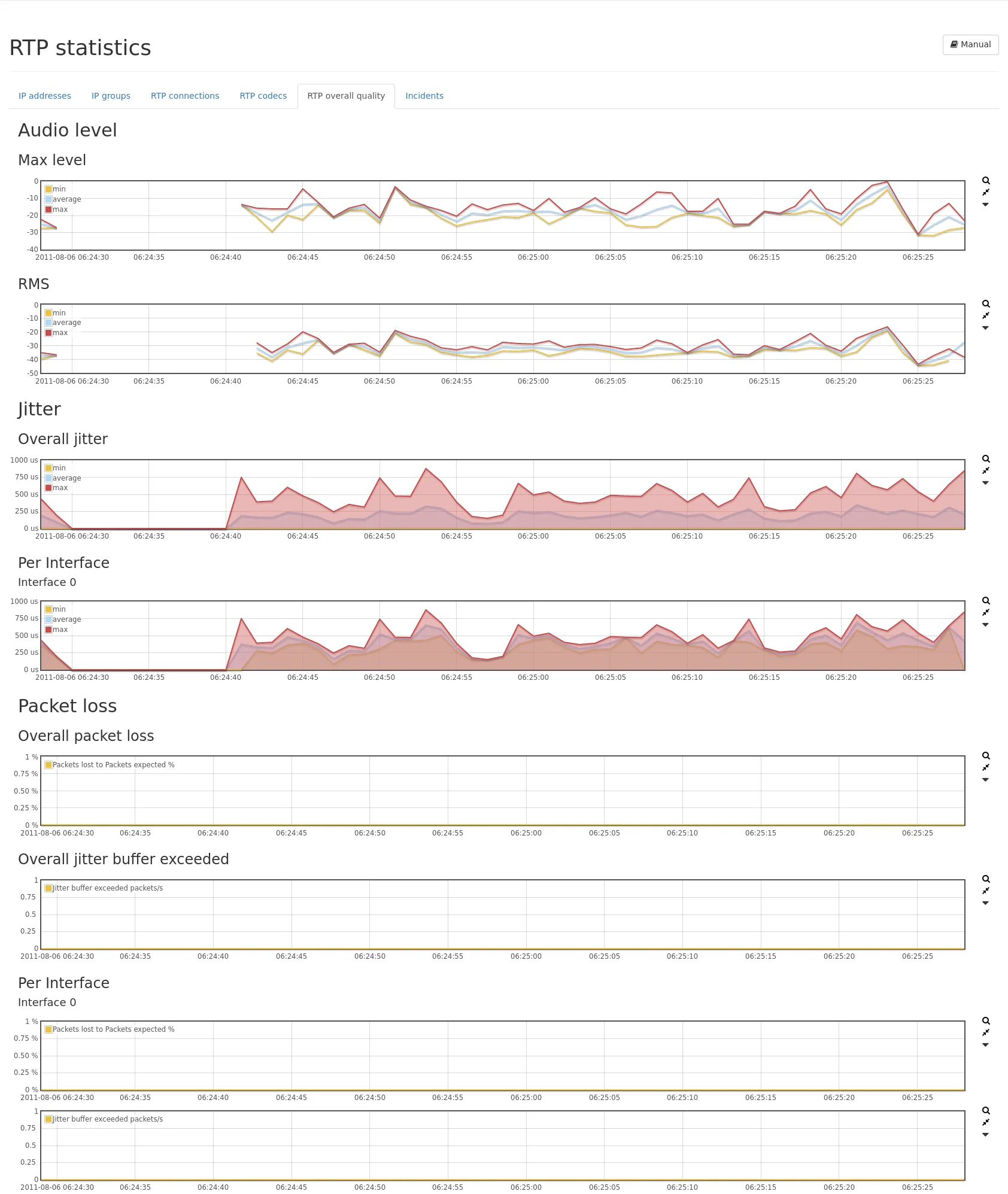 Section titled “RTP overall quality”The RTP overall quality tab provides graphs about the jitter and packet loss.
