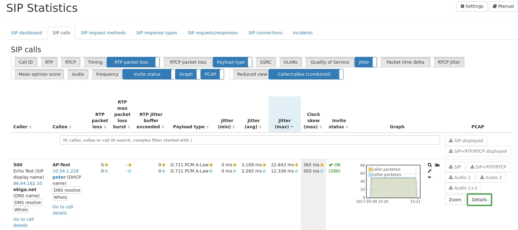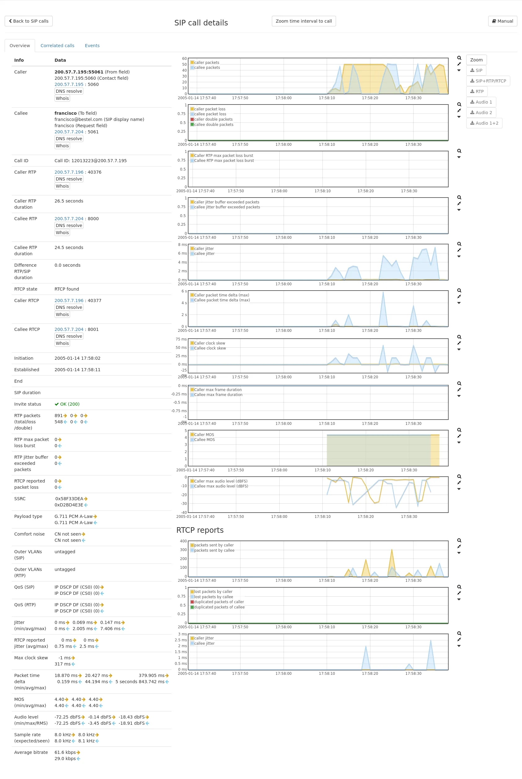 If an RTP connection was found for that SIP call, RTP statistics are shown as well with additional information for the actual voice/video connection.