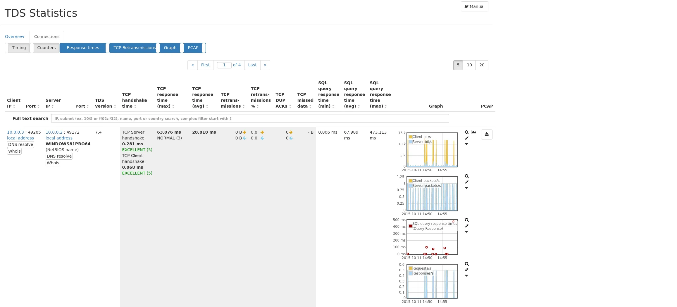 All TDS connections with their client and server IPs and ports are shown together with the recognized TDS version. If the Timing toggle is activated, the start and end time, as well as the duration of the connection will be visible. The Counters toggle switches visibility of common traffic counters for total packets and bytes, traffic rate counters for packets per second and bit per second, as well as the recognized valid SQL query and response messages. The connection quality can be evaluated in two columns: the Response times toggle enables the view of TCP handshake time separated for client and server, maximum and average response times, as well as SQL query response times (time between a SQL Batch query or Remote Procedure Call request sent by the client, until the server responds). Retransmissions (in byte and as a percentage of the total traffic), missed bytes and duplicated ACK-packets are shown when the TCP Retransmissions toggle is enabled.