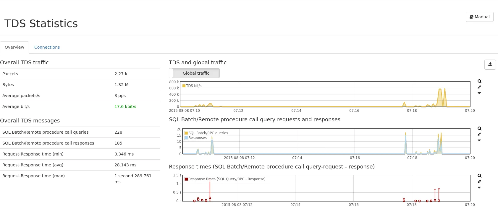 Information about all TDS packets are shown as values and graphs to give a quick overview. Global traffic can be shown in the traffic graph to see the share of TDS on the overall traffic. A PCAP download button allows capturing that traffic.