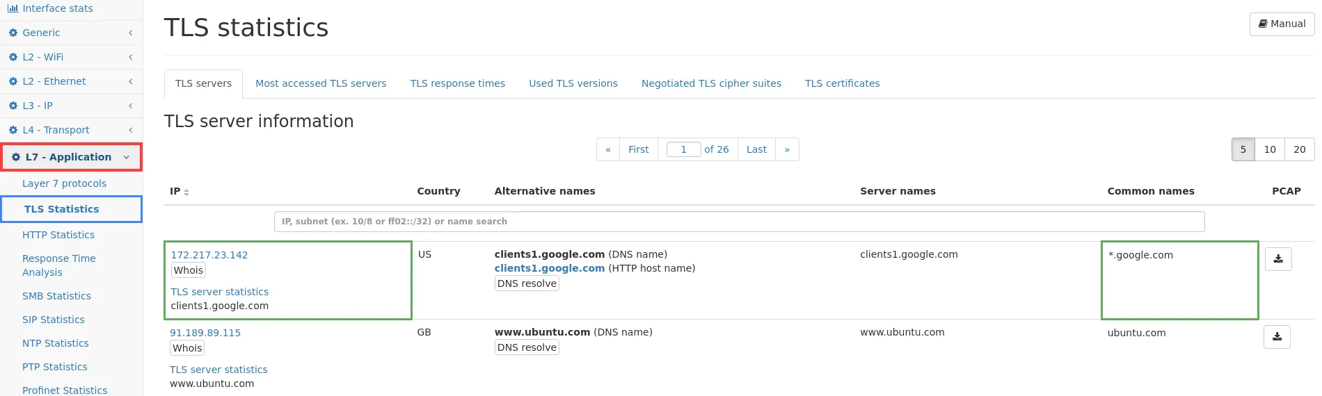 - Common names: Similar to the server names, the common names of all seen certificates are listed here, which have been returned by the server.