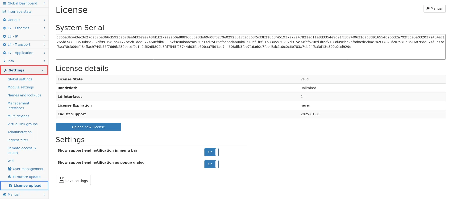 The Allegro Network Multimeter comes with an installed License, which may have some limitations according to the support contract details. A new License can be uploaded by clicking the Upload new License button and selecting the file from your computer. A valid License takes immediate effect.