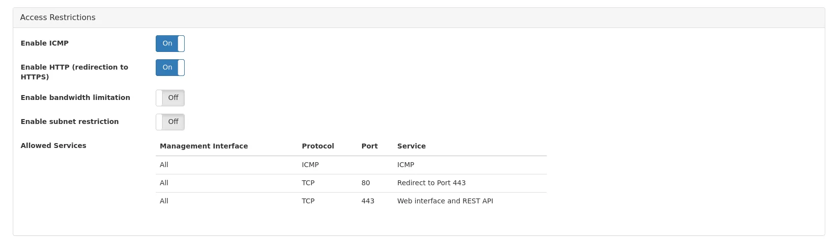 Section titled “Access Restrictions”Since firmware version 4.5, access for all services available on all management interfaces can be restricted.