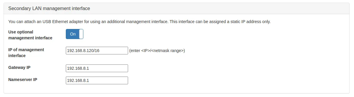 - Use static IP: It is also possible to configure a fixed IP address for the wired management port. You can enter any IP address for the port. The IP address must end with a slash followed by the subnet size. Example: /24 stands for a subnet mask of 255.255.255.0. Optionally you can enter the IP address of your gateway computer and the IP address of the DNS server. You can leave them empty if you want to directly connect the device to another computer with no router involved. In this mode, the web interface can be reached by the static IP address you configured.