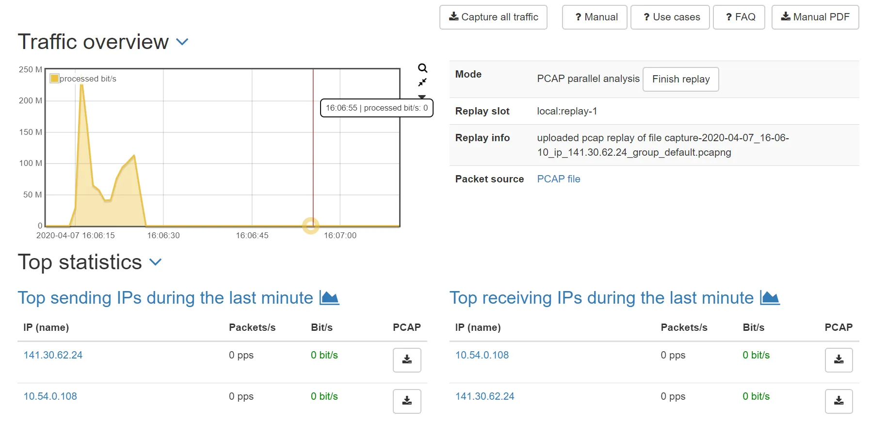 Section titled “Packet ring buffer analysis”The packet ring buffer analysis works similar to the PCAP upload, except that a part or the total packet ring buffer is used. Please navigate to the packet ring buffer statistics at Generic → Packet ring buffer. Select a time which shall be re-analyzed.