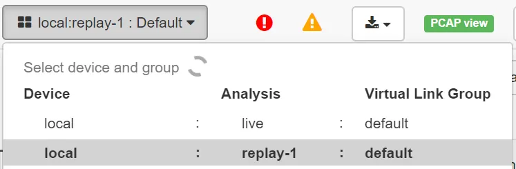 To switch between the PCAP and the live analysis, use the selector in the top menu.