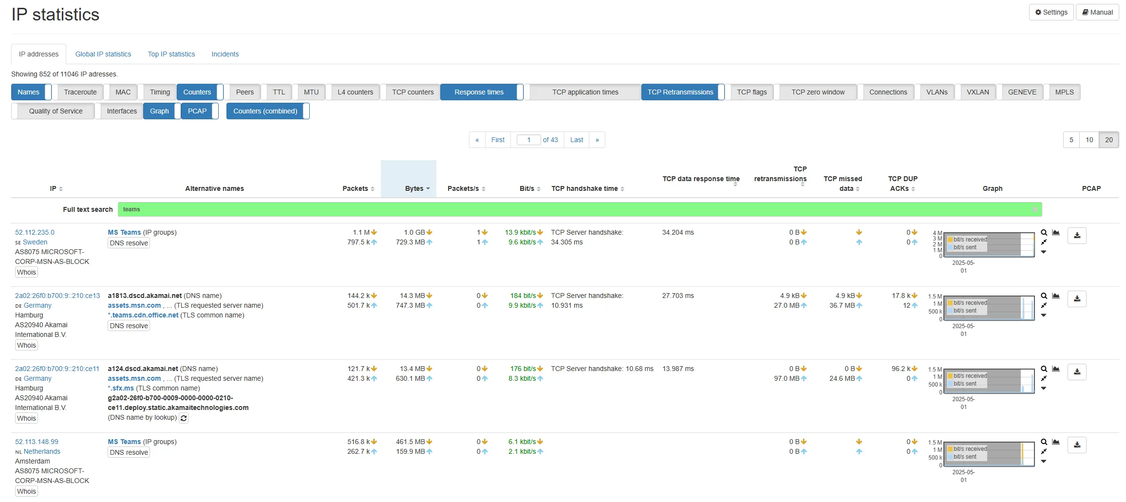 Section titled “Microsoft Teams control traffic”Microsoft Teams traffic is TLS encrypted. This does not allow for decoding and analysis of the control connection content. Since TLS uses TCP as the Layer 4 protocol, all of the TCP connection quality statistics can be used for debugging. Additionally, the response time for the TLS handshake and the first encrypted TLS data response time is available.