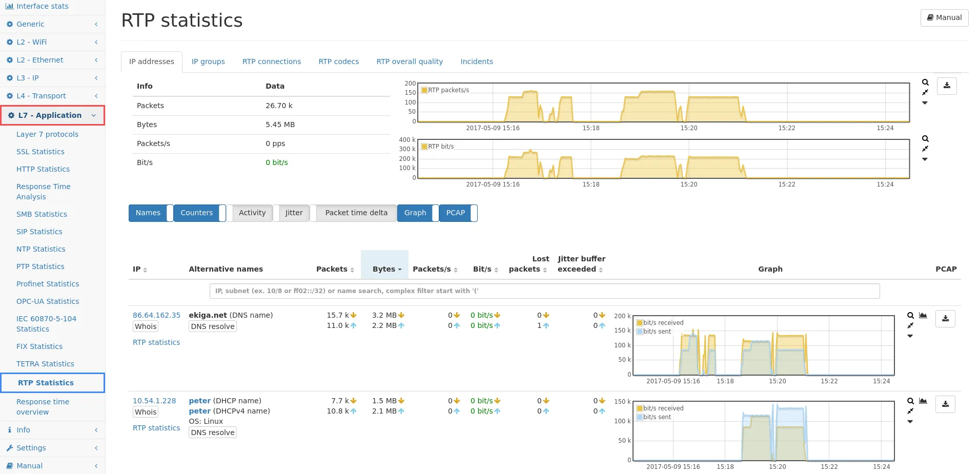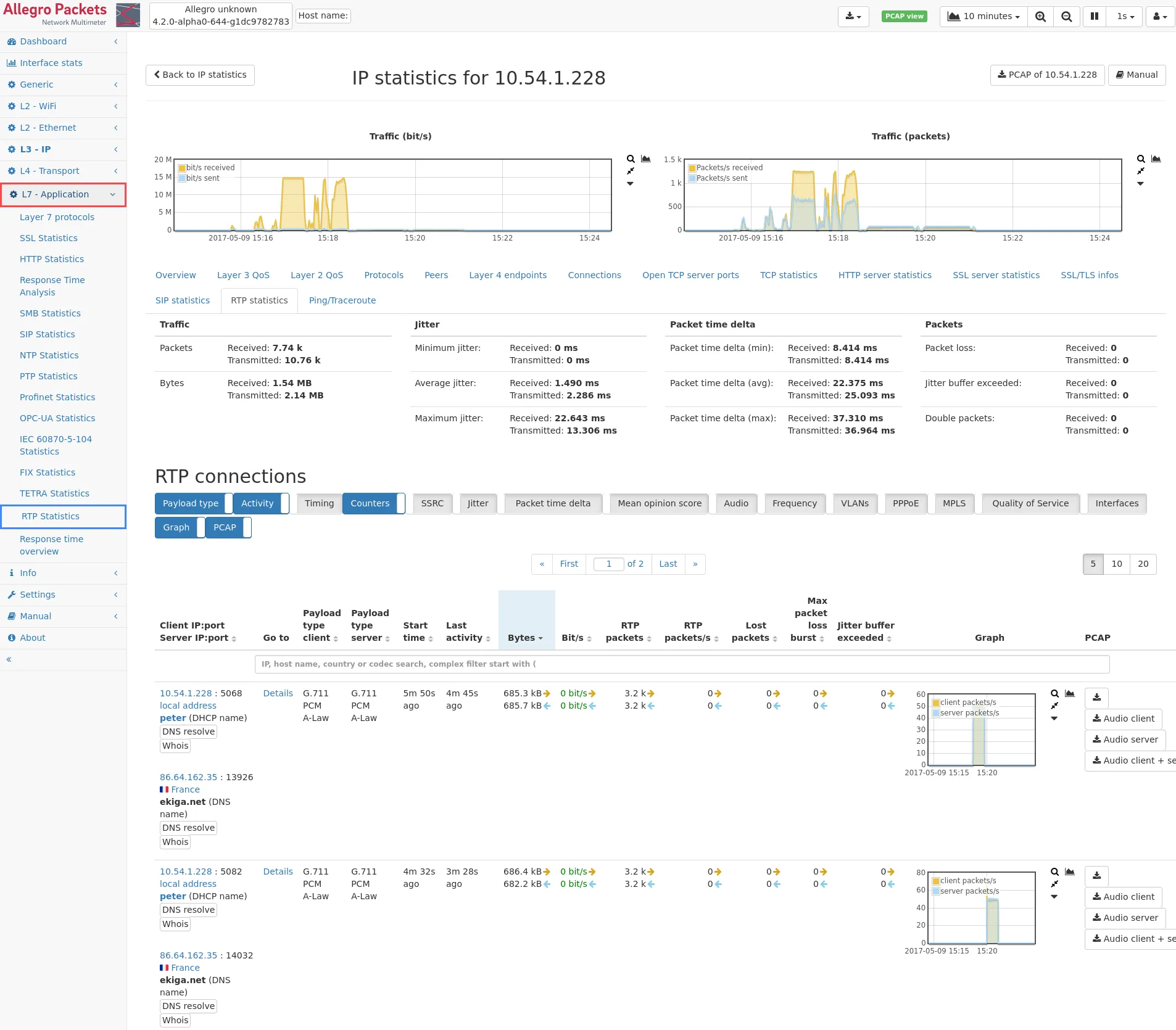 This allows you to see which IP addresses have used the protocol RTP. It shows an overview of the RTP packet loss and jitter based on RTP sequence numbers. To obtain detailed information about individual connections, click on the IP address. This will show RTP packet loss and jitter for each connection.