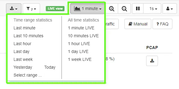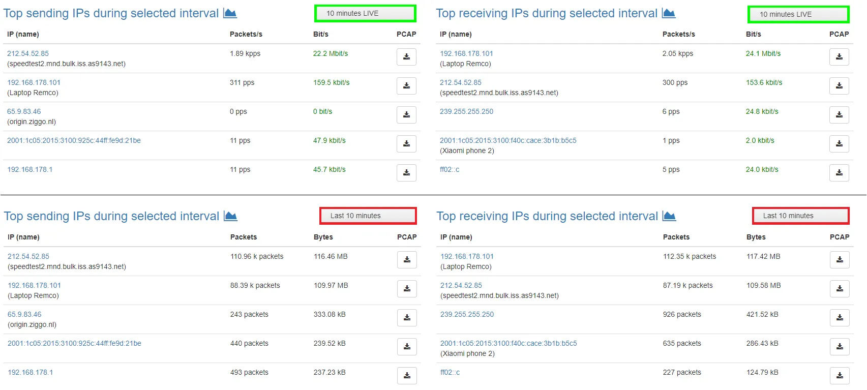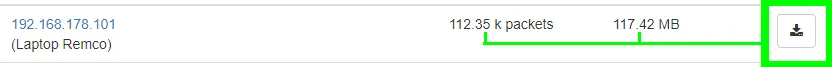 The download buttons can also be used to initiate pre-filtered Live captures. E.g. clicking the download button next to IP 192.168.178.101, will initiate a capture that is already pre-filtered to only capture traffic containing that IP during the selected time interval.