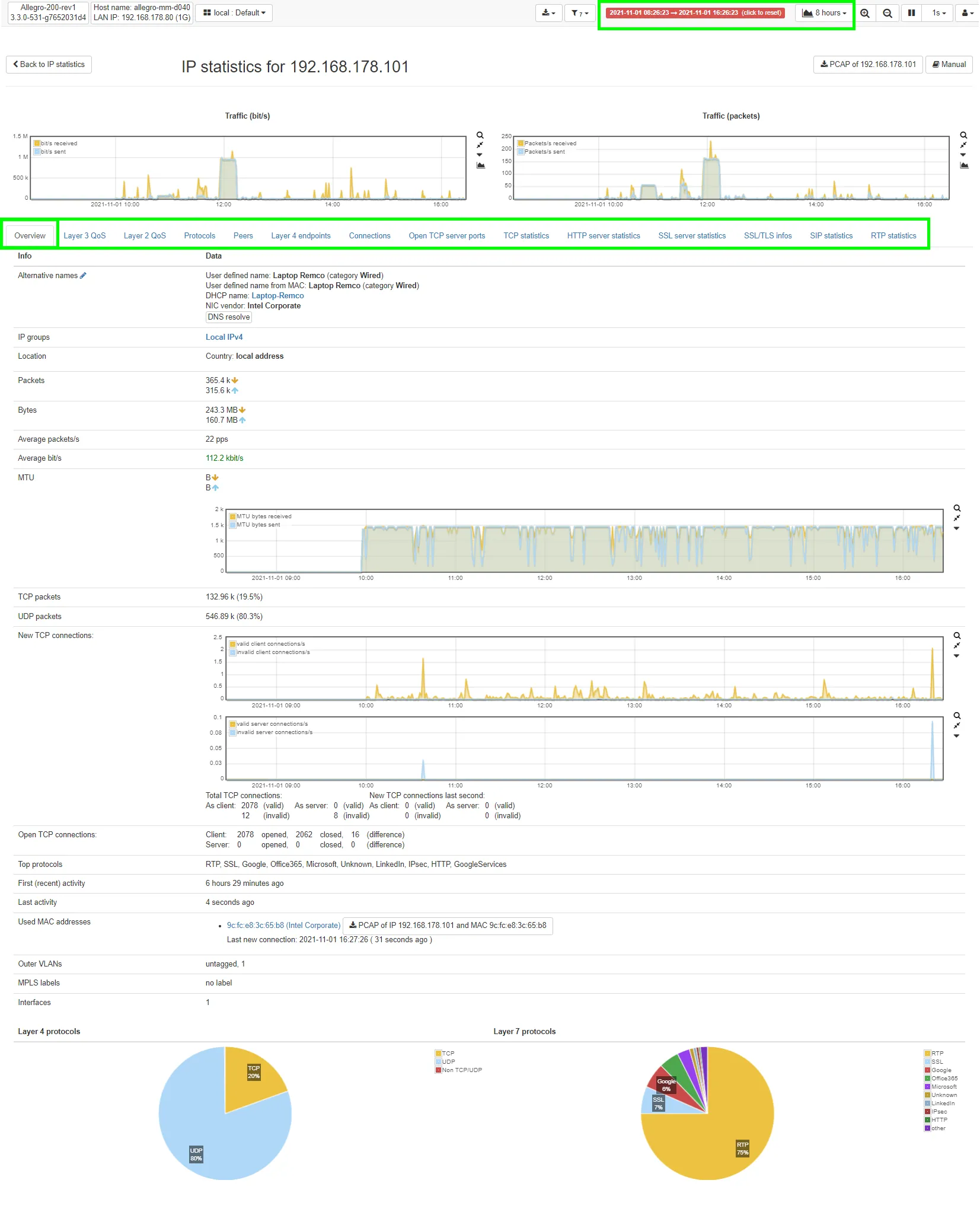 Section titled “IP details page”If you want very detailed information about a certain IP, go to the IP details page of that specific IP. This is easily done, by clicking on an IP, everywhere throughout the Allegro Network Multimeter web interface. This will bring you to the IP details page of that specific IP address.