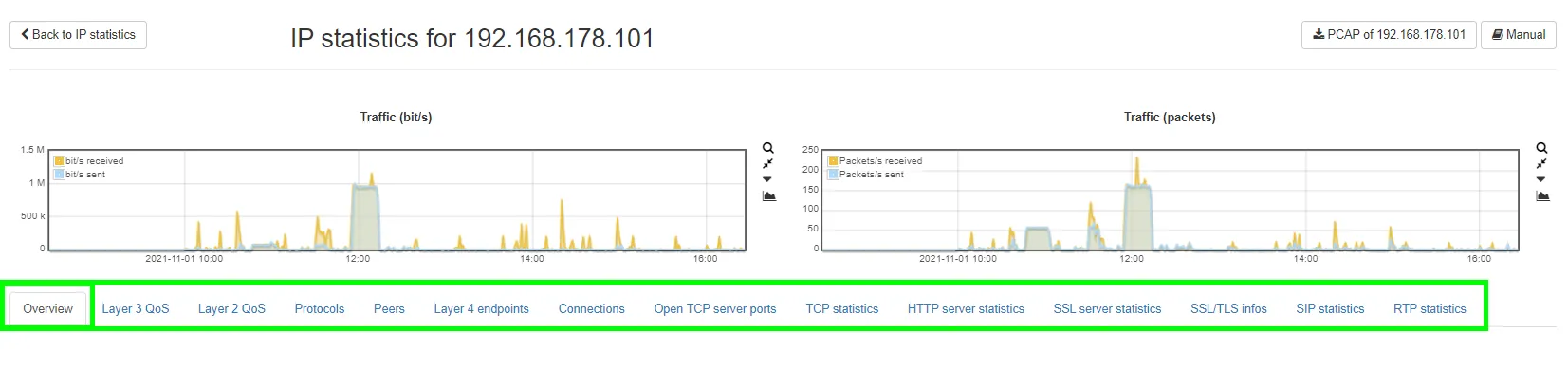The IP details page, gives you 1-click access to all sorts of network performance information during the selected time frame. The different tabs that you can go through on the IP details page, are highlighted in green in the image below.