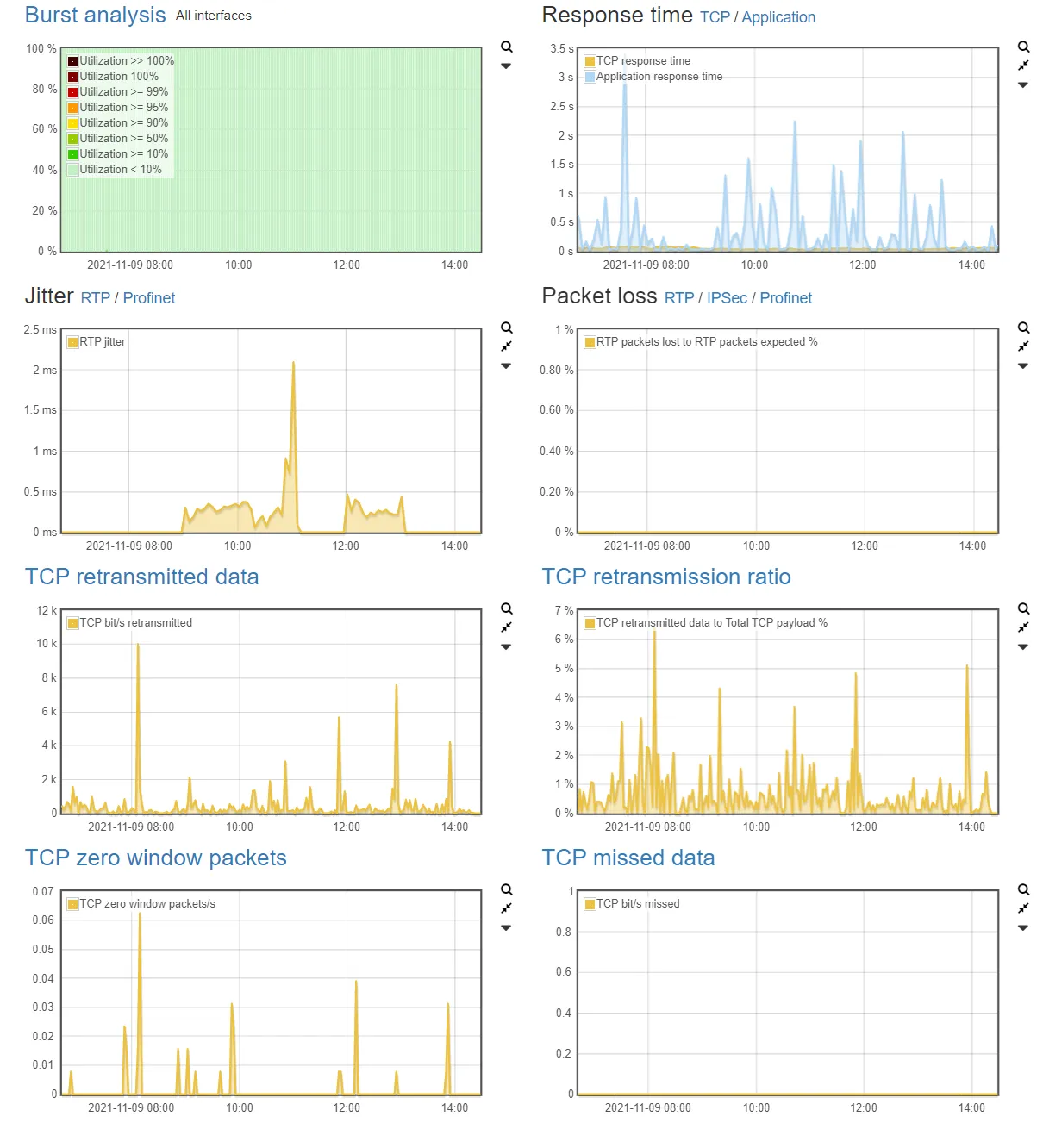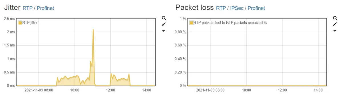 Section titled “UDP Jitter & packet loss”The next two graphs provide trending and actionable insights for UDP-based protocols RTP and Profinet. First up is the graph depicting jitter over time.