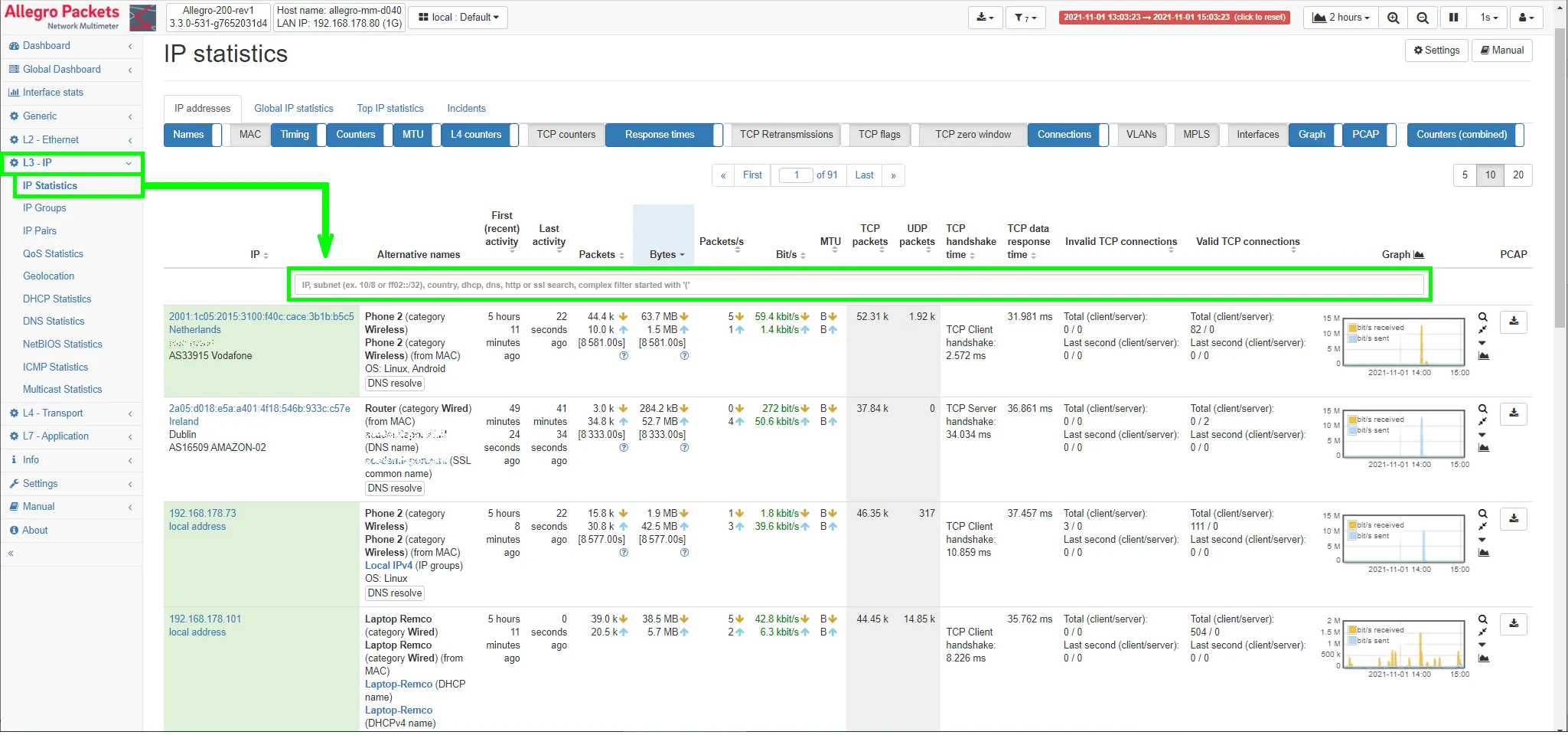 Section titled “IP statistics (all IPs)”If you are looking for network information based on multiple or all IP addresses, or want to start your troubleshooting journey from an IPs perspective – the L3 - IP → IP Statistics page is the right place for you.