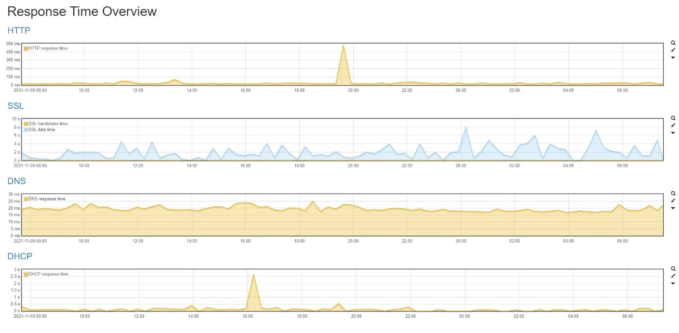 Section titled “Response times”The second graph provides you with trending information about global response times for TCP, HTTP, TLS, DNS and DHCP.