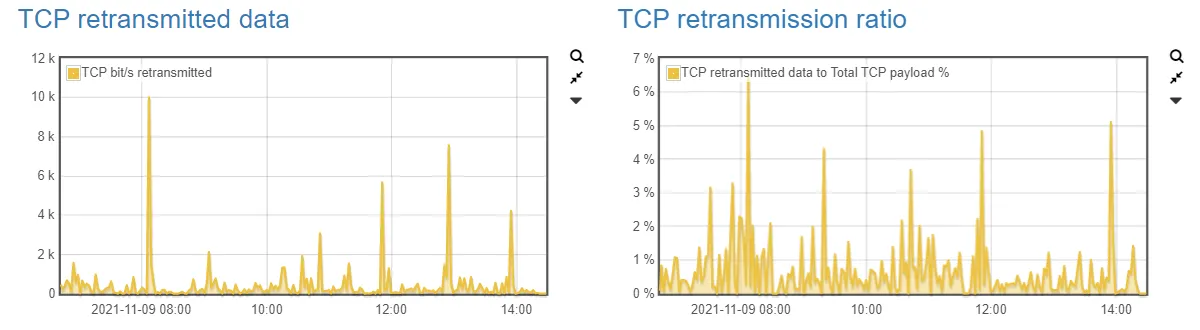 Section titled “TCP retransmissions/packet loss”The next two graphs provide trending visibility and information about TCP packet loss in your network. TCP retransmission are seen in all networks, it’s the amount of retransmission - and better yet the retransmission ratio in percent - that indicate if things are problematic in your network. This is why graphs for both TCP retransmissions in absolute numbers, as well as in ratio are presented to you.