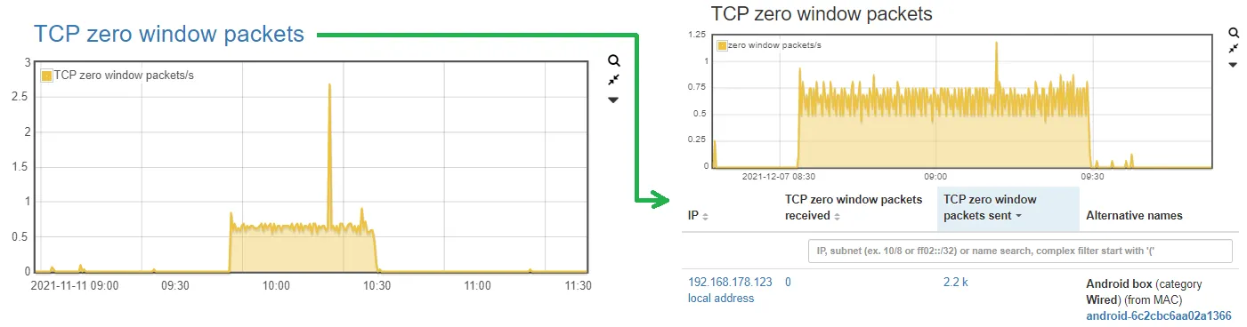 Section titled “TCP Zero window”For identifying application performance bottlenecks and/or server capacity issues, the TCP Zero Window graph is a very, very powerful instrument. Here’s why: TCP zero window packets are being sent out by a server (or client), whenever it cannot optimally handle the oncoming traffic any more. Basically the servers’ (or clients’) receive buffer gets full and so it will notify every sending party to slow down – by means of TCP zero packets.