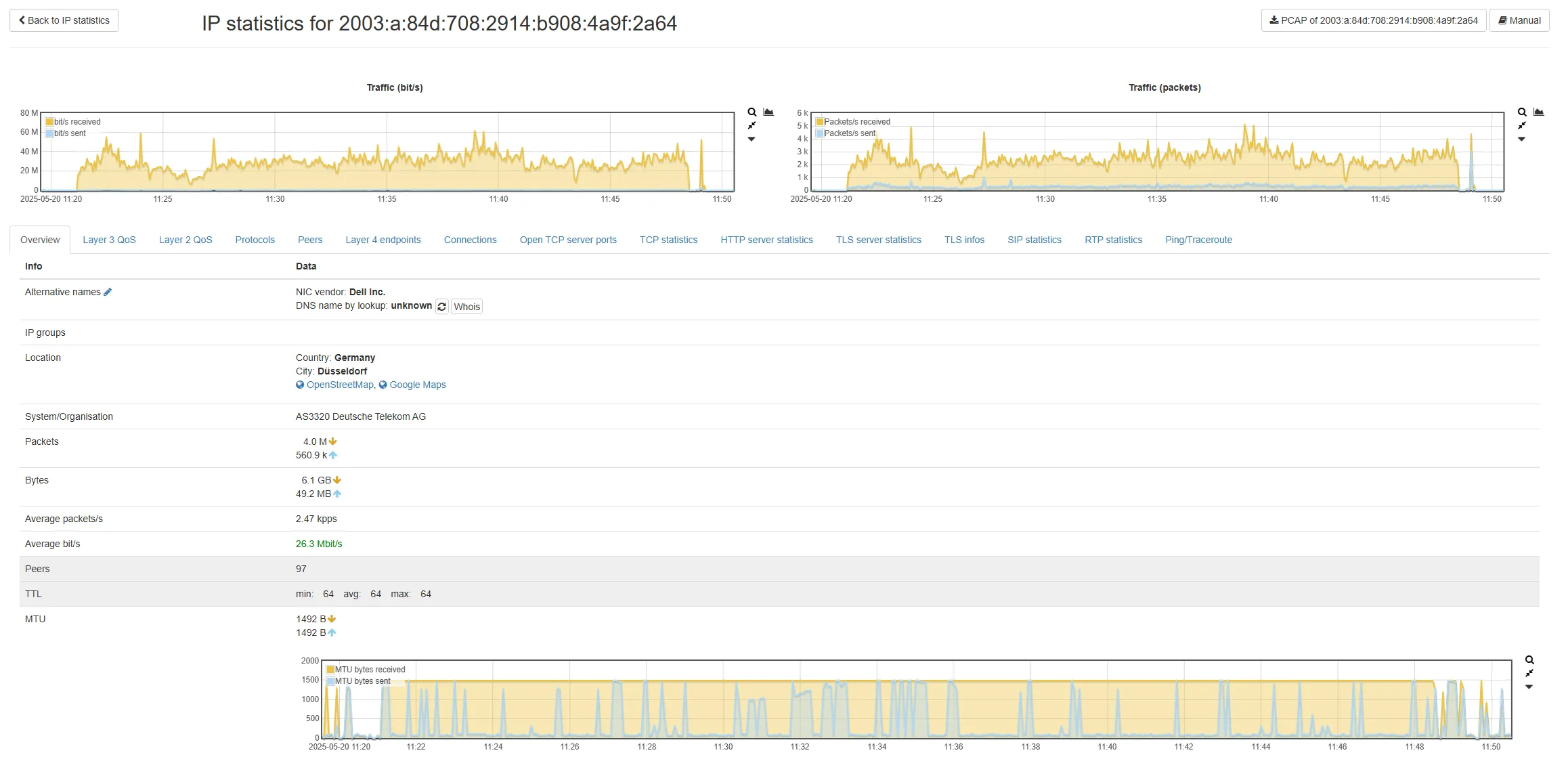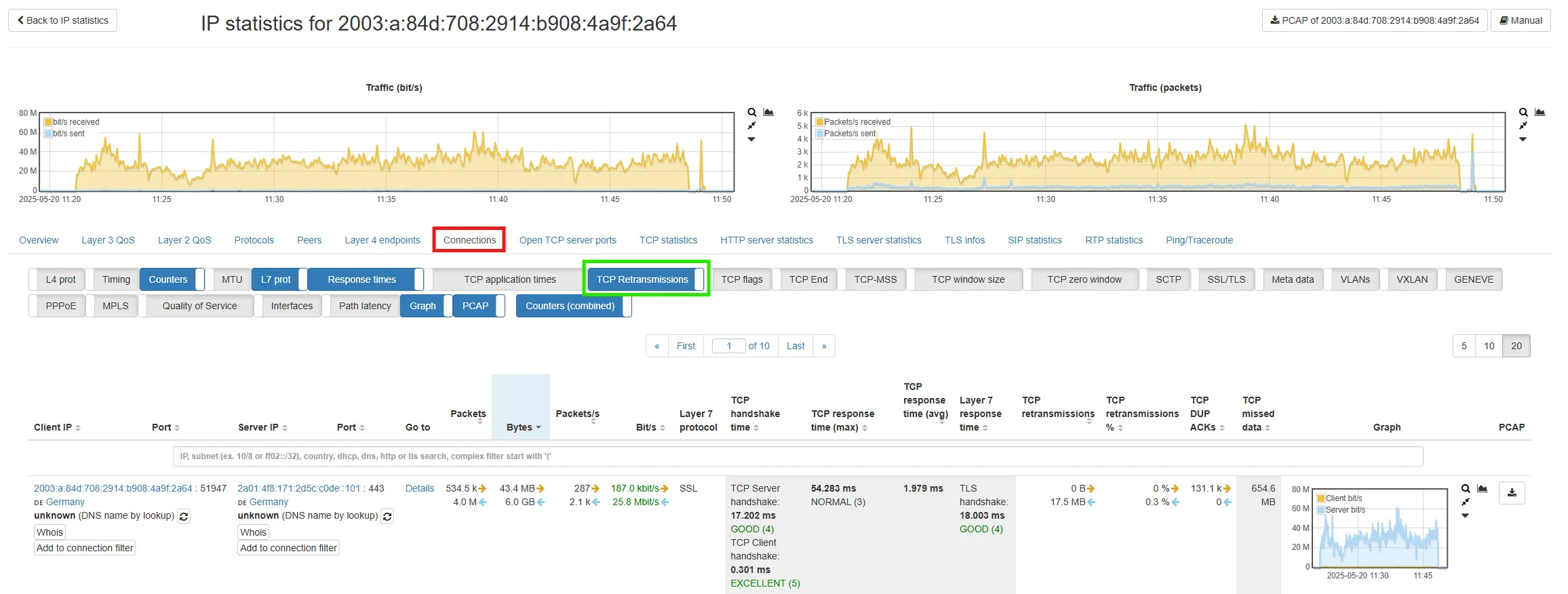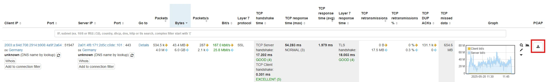 You can use the number of retransmission to estimate if there was a bottleneck between the sender and the receiver and if more packets had to be retransmitted. Is there a high TCP retransmission? This could indicate an overload of the network segment or a WiFi device. If you need an even more detailed analysis, you can use the PCAP button to extract the connection packets.