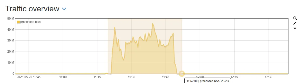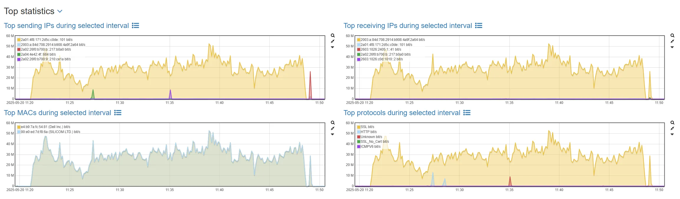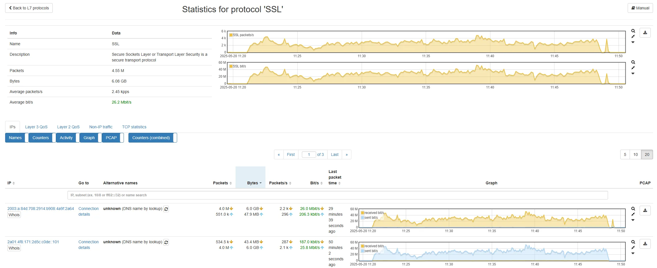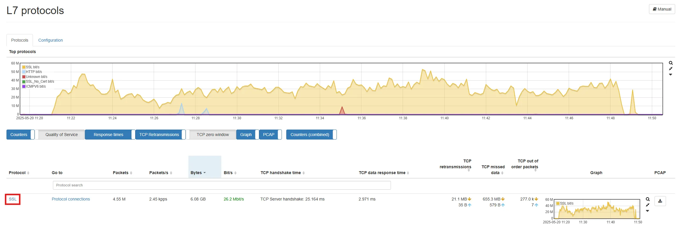 Let’s check by clicking on Top protocols during selected interval for the cause of the slow connection. In our example, the SSL protocol showed up with a large amount of packets transferred in the selected timeframe.